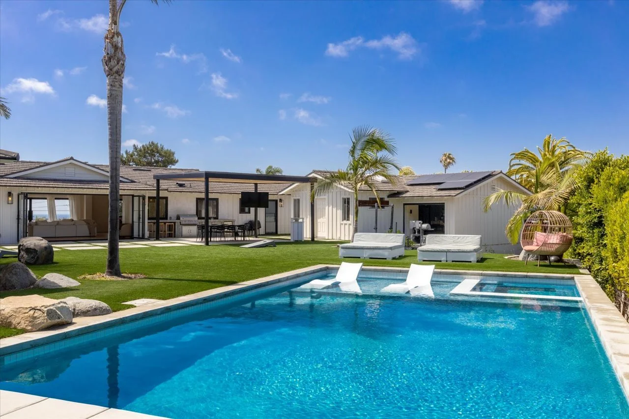 Set on over half an acre, this home features a brand new pool and spa, expansive outdoor entertaining areas, and sleek, high-end finishes throughout. Inside, soaring vaulted ceilings and an open-concept layout connect light-filled living spaces with a designer kitchen anchored by custom cabinetry, a statement island, and a butler’s pantry for added convenience.